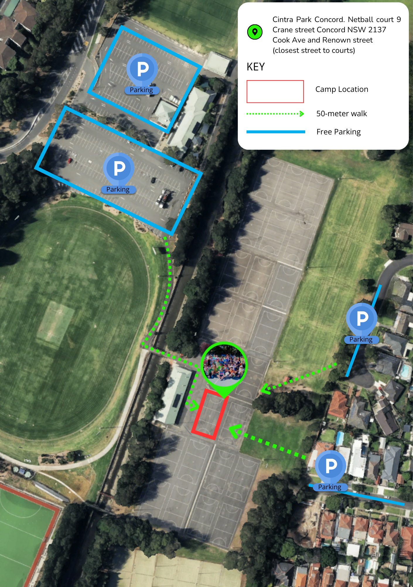 Cintra Park Concord. Netball Court 9. Crane Street Concord NSW 2137. Cook Avenue and Renown Street (closest street to courts)